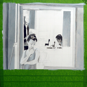 The New Work February 25, 2013 It's not as though I don't already have enough series to work on... but I do need to get the set for the Ratner underway, with only a year to prepare. Well, less than that, really, since I'll need everything to be completed before the hanging date. So, at right is the first panel of the group. I haven't got a name for it, nor for the series yet, but it's a start. The green that you see is the Frog Tape, which I discovered when repainting the guest bedroom, and which does an incredible job of blocking out areas where one doesn't want paint to go. The top and side edges are blocked off, and there's enough space at the bottom to mimic the format of instant photos, which is an idea I wanted to play off: the contrast between the modern instant picture, and the tedious, time-consuming process of applying glazes over a grisaille (like the Old Masters). I'm doing the underpainting in acrylic, and as I think I've mentioned before, acrylic is not my friend. It's supposed to go quickly, but it seems I need to put on at least 3 coats before it even starts to look less streaky. Grrr. Currently reading: White Nights, Feodor Dostoevsky |