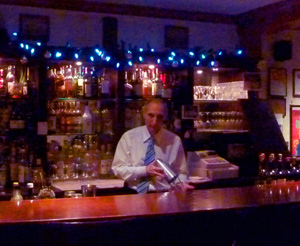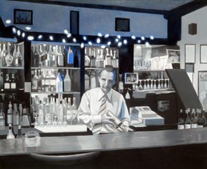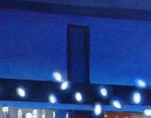 Pouncing January 19, 2014 I've been distressed about the obvious brush marks in the upper ceiling area of Carmine's Trattoria, and since it's the first of 7 (at least) of the Instant Images paintings, it's vital that I find a way to make the glazing work correctly. Held my breath and used some of the medium with a transparent blue, then employed that pouncing-with-the-side-of-the-brush technique I'd used a couple of weeks ago. It looks like it worked, but I'll be able to tell for sure tomorrow in good, strong daylight. The pouncing created a kind of grainy look, similar to what you'd see in a black-and-white photo shot with the old 400 ASA Tri-X, but that fits right into the series' theme anyway. It's much more believable than the brush strokes. |