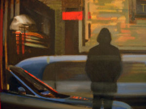 | The Need for Magic December 6, 2008 I think that art raises our awareness of the special, the out-of-the-ordinary experience in day-to-day life. So with that thought in mind, I became more and more frustrated with the work I was doing on Time Piece yesterday. The back wall in the painting is made of tile, probably an off-white in reality, reflecting all sorts of color from the neon lights across the street that shine through the glass window in front of it. It's in fairly deep space in the picture, so it has to be dark, and that's what I was going for yesterday. I spent a lot of time mixing the right murky green that I see in the reference photo, but in applying it had to cover up some of the turquoise, olive green, and orange that was already there. This effectively killed the magic of the reflected color, so I tried painting the murk as a glaze instead of the opaque mix I was using. But by nightfall the light in the workspace had dimmed considerably, adding to the sense that I'd gone too dark, and I had to just put the brushes down and walk away from it. The feeling of failure was compounded by visiting a top-notch show of illustration the night before. A.B. was in town, and he stayed with us Thursday night after we went to Rockville to look at the exhibition. The first thing that caught my eye as I looked around was a gorgeous long format illustration of zebras running in a herd from visual right to left. After that, there was more knock-your-eye-out stuff. Each illustrator's style was unique and showed years of solid development, with pictorial matter ranging from chickens to Pegasus to an African statesman. A concurrent show featured artists' books, and was just as fabulous. In the past, when I was working full-time away from home, such shows used to make me feel frustrated because I had so little time to paint and create my own stuff. But I've had the great advantage of having the time the last couple of years, so now it's a matter of quality. How do I measure up? My standards are pretty high, and I'm (like most artists) very critical of my own stuff. So with the darkness descending yesterday, I felt less and less adequate, and started wondering whether I will ever get to be as good as I'd like. This morning, there's enough light in the workspace, even though it's an overcast day, for me to see that the color on the back wall is working very well in conjunction with everything around it, and the other areas I painted yesterday (the lighter tiles that seem to be suspended above the back wall, the roof of the limo) are also in harmony. It's really important to get the all the areas of the painting to work together, like a symphony orchestra, and I can see that Time Piece is headed in that direction. As far as the magic of the tiled wall goes, I can always add some colors back in with more glazes, and that'll (hopefully) be even more exciting, visually. |