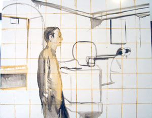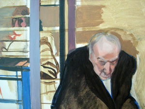 Crabby September 12 , 2008 Making progress on Conversation v-e-r-y slowly. It's hard to paint straight lines, plus I realized the perspective is way off on some of the bevels or frames in the angled mirrors. I paint for a little while, then have to step away from it. I really want to nail this painting, but feel constrained by the need to finish it quickly. The seated male figure does look better and better. I had to adjust the skin color again, but it was the right thing to do. Met with R. yesterday for coffee and conversation (no pun intended) and had a great time discussing art and trying to stay away from politics, which have the two of us completely flummoxed at this point. She is doing a painting of Obama. Can't wait to see! |