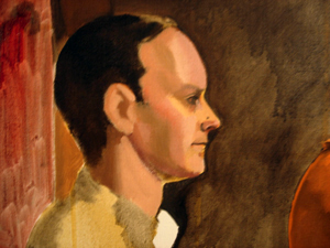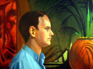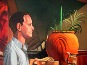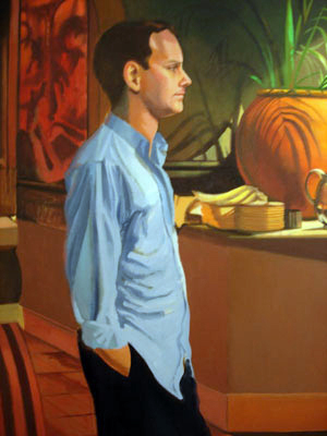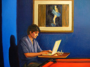 Getting Real September 21, 2008 Sometimes you just have to face reality, and for me that means coming to terms with the fact that Conversation isn't going to be finished in time to make the much-anticipated reception at the Levine School of Music. I worked on some of the background detail and the table on the left side last week, but finally had to call it quits and throw down my brush. It's too hard to sustain interest in one painting day after day after day. I feel like I've got a choice between doing a lousy, quick job and doing it right. This painting needs subtle details and some atmosphere, and that ain't gonna happen by Monday. I really need to get back to some work with soft blues and greens... Jay on Read or the Postcards series. |
