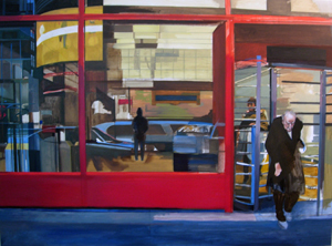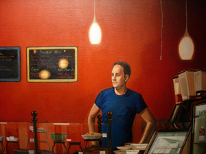 Recent Work February 4, 2009 He Searched is coming along rapidly, much faster than any painting I've ever done. Considering its size (40"h x 50"w) that is really something. I repainted both the shirt and the head today, taking out the purple-y color from the shirt and making it more of a blue-green. I think the head might be done. I changed the skin tones to better match the room surroundings, which would, of course, have an effect on the color, and now there is a more unified look to it. The color in Conversation has troubled me for quite a while, so today I glazed over the entire left side in an effort to tone it down a bit. It does look better, probably needs some highlights to be brought back, and the photo I took of it this afternoon has a lot of glare on the wet spots, so we'll see how it looks once it dries down. Jay on Read is finally looking like it has some shadows under the overhangs on the building, and I put in the flower stand on the left side. Also worked on the tree and the foreground. And Coffee After Work is progressing. It doesn't have that excessively lonely, lost look that the previous version had. Things are in proportion to each other, which is as it should be. At least in this painting.