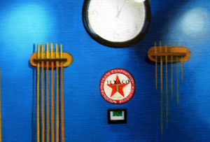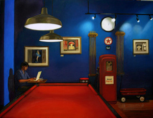 Stillness December 26, 2008 Spent most of the day refining Food for Thought and Diesel. I keep seeing minor details that would, if painted correctly, make the paintings so much better. Attending to them is paying off; both now have that eerie sort of stillness that I was aiming for in the first place but wasn't able to achieve— that sense of utter tranquility, of time suspended. Having the time to really look at the reference material and figure out what colors or values need to be adjusted, or whether a line should be painted more clearly makes a difference. I'm putting a second set of pool cues in Diesel. It's not easy to paint straight vertical lines, but somehow it's working. The clock still doesn't look round to me— I'll make some sort of template or maybe dig one up from my old graphic design days. The painting on the right side looks catawampus, too; will have to get the t-square out and repaint the frame lines. Am taking G.S.'s advice and putting circles of light under the lamps on the pool table, and darkening the areas around them. I think I've got the face in Food for Thought done, will look at it again tomorrow in stronger light. It's much better now. Both paintings should be ready in time for the show in January. |