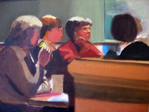 Back in the Saddle December 30, 2008 9:30am Spent all of yesterday gallery sitting; got up early today and am already working. Am looking at four uninterrupted days of painting time, hooray! I'm placing a thumbnail here of the seated group of figures on the right side of He Searched, will add more late this afternoon. The sun is shining and the day is promising. |