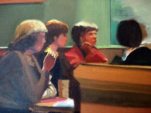 Picking up on Conversation December 15, 2008 I'd been working hard on Conversation in October, so hard, in fact (in preparation for a show), that I flamed out on it and haven't been able to even look at it until today. Didn't know where to start, finally decided to try once again to capture the female figure opening her cell phone. It went pretty well; though the skin tone still isn't what I want, the whole character of the painting changed for me. Maybe that's what it needed all along. Now I can buckle down to the tedious part of painting the pillars and adjusting the background so it's less orange-y and more like warm wood. Did some more work on He Searched, too--- it's going awfully well, and very fast. There are two paintings that I did earlier this year that I've just been really unhappy with: Food for Thought and Diesel. I took them out of their frames and am going to re-work them. I repainted the two hanging fixtures in Diesel today, as well as the gasoline pump. They look SO much better. There are a lot of subtle changes in the lighting on the back wall that are going to be nasty to work on--- painting that type of thing is an all-day affair. I'll have to mix up a lot of paint in varying values, and paint wet into wet, feathering the edges until you can't tell that there was a brush involved. Food for Thought needs the same kind of treatment on the back wall— more subtlety, especially around the light globes. I want them to absolutely glow, adding a little mystery to the scene. And I think I can do a better job on the face.