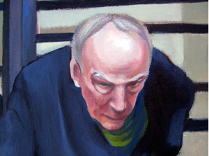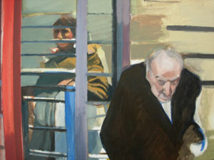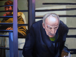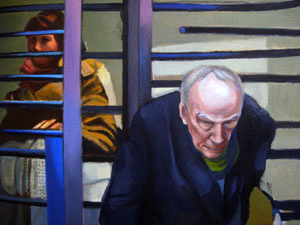 Monday September 29, 2008 After an evening spent in good company, I got a decent night's sleep and was raring to go on Time Piece this morning. Have blocked in the features of the elderly man's face, and done a bit on the woman coming through the turnstile behind him. Am excited about the prospects of this moody, existential painting. |