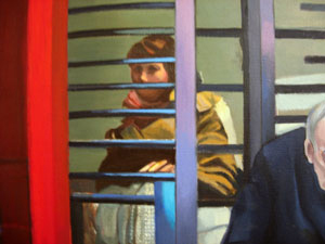 Time to Stop January 2, 2009 5:20pm I actually put in six and a half hours of painting today. Am dead tired and my feet hurt. Went back to Postcards 6 after uploading a photo of it to the works in progress page and added a lot more of the orange glow. Will upload a new photo tomorrow. It only needs one or two more sessions and it'll be done. Painted in the woman coming through the turnstile in Time Piece. Close-up at right. |