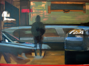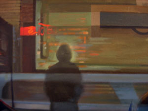 | Ruminations December 11, 2008 So many things went through my head today while working on Time Piece. The back wall has to be finished before I can paint the reflections on the front window glass, so there was a lot of analysis and comparison to be done. Several areas had to go much darker. I thought about an article I'm reading in the November 16th edition of the New York Times Magazine about the guy who wrote "The Gift," and how what I was doing was basically crafting a gift for the viewer. If you wonder why it takes me so long to finish a painting, it's because I'm trying to get it right: just slapping paint on isn't my style, and it feels shoddy to me. This is the problem I have with art that looks like it was hastily done, without any real evidence of thought---because that's what art is: evidence of cognition. Anyway, I compared areas to each other and checked the reference photo a lot, and feathered and blended until things worked together. I can already tell that the "o" in "No entry" is going to have to be resized. It does take time, but it's satisfying when it's done right. Yesterday, M.P. said to me on the phone, "Do you realize how lucky you are?" She was referring to my having escaped from the world of 9-5, and I told her that I did. I just want to spend my days making art that speaks to the common person, engages the viewer, and represents our time. Oh, and that's flawlessly executed. I have a long way to go. This afternoon I worked on He Searched. It looks like it's going quickly because it's still in the underpainting stages. Whisking on a wash of color doesn't take long---after that comes the modification. I'm worried about the skin tones on the figure, and challenged by the shirt. It should be white, to draw attention to the figure---in the reference photo it's dark blue, so I'm having to wing it. |