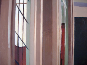 Attacking the Pillars December 30, 2008 5pm It's harrowing to try to pick up on a painting that needs fine tuning and that one hasn't worked on in a while. Today I went back to Conversation, taking a deep breath and throwing everything I've got into getting those pillars to work. So far, so good. There will be some color adjustments here and there, but at least I figured out which plane was getting the light and which was more of an old rose color. The other thing that was scaring the socks off me all this time was the seated female figure, but FINALLY it looks like her face and hair are believable. Also: repainted the pool table in Diesel. The spots of light on the table look much better. ********* It takes so little to make me happy. This morning, it was the realization that the stripes I was painting on the banquette (in He Searched) would reinforce the shadow patterns of the palm fronds on the jar. I had, actually, a physical response to it, and did a little spontaneous dance. Does this happen to other artists? I'm worried about the shirt. Does it look like it coexists in the same universe as the rest of the objects in this setting? I think it needs more yellow. |