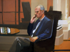 Committment January 12, 2009 I found some other shots of the St. Francis lobby (the setting for Conversation) and have been able to study the furniture and interior space. It helps me understand what exactly I'm painting---for example, the leather on the almost black chairs is pretty pooched in spots, much more loosely attached to the frames than I had thought. I repainted the foremost chair, making it less of a black silhouette and giving it more of a deep bluish-grey color, as well as a ripply appearance that even fools me--- I keep thinking the canvas is loose on the stretchers. The photo of the painting is picking up a lot of reflected light from the window in the space I'm working in, so it looks lighter than it really is. But the other photos of the lobby help me see that the columns or pillars have a marbly appearance, and that the back wall reflected in the mirrors on the extreme left, is a much lighter color. Conversation is going to take some time to finish. There's a lot to it, and I've invested too much energy in it already to take a slap-dash approach to completing it. I'd rather go inch by inch and make sure everything in this little universe is coherent. |