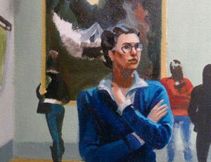Playing With LightJanuary 4, 2011 The back wall of the room in Museum Encounter is very tricky. It's a pale green, but in the corners it goes kinda brownish. I'd originally tried creating the shadow color with Payne's Gray, but it didn't look right. P.T. was over one day for a quick visit, and she agreed: brown in the shadowy corners was the way to go. But while getting the color right is one thing, even worse is the gradual slide from one value to the next. I'm trying to keep the brushmarks invisible, so as to lure the viewer into wondering (from a distance) whether this is a painting or a photograph. I like that kind of visual fun. Anyway, keeping the brushstrokes invisible requires a lot of careful blending, and reverses of stroke from horizontal to vertical to horizontal again, in order to smooth things out, make the transitions believeable, and avoid sueding. So this is probably more technical information than you wanted, but there it is. Now, back to work. |