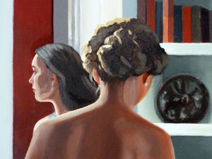 Observation vs. CommentaryJanuary 26, 2011 I've been reading up on Dutch genre painters of the 17th century lately (at Pratt, we revered Vermeer like a demi-god), and it's been interesting to see how they used symbolism. It makes me wonder if I should be doing that, too, in an effort to make my paintings deeper and more meaningful. But I draw a blank when I try to think of present-day symbolic images. The wedding painting, for example, is a simple narrative about a young woman being attended to by one of her bridesmaids while another looks (wistfully?) out the open window; they're in a very traditionally decorated room, with a fireplace, mantel, and bookcases in the background. Maybe I can come up with something on the shelves that gives the viewer some other insight into the goings-on. But what? |