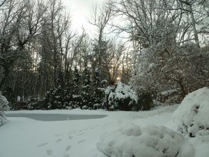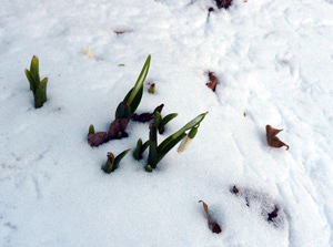 Snow and SnowdropsFebruary 22, 2011 Woke up to a surprise this morning; the back yard looked like a thin layer of confectioner's sugar had been sifted over it. Just yesterday I'd been marveling at the appearance of the first snowdrop in the yard. Today it was almost invisible under the snow. There was mass hysteria among the bird population, so I had to get out and throw some seed around before brewing my morning cup of coffee. Worked hard all day on six paintings, and finished Dinner Date, though I might go back and redraw the mouth on the guy. Spent the last two hours tonight (it's a quarter to midnight) on Ram, Williamsburg--- it needs to be a lot darker. |