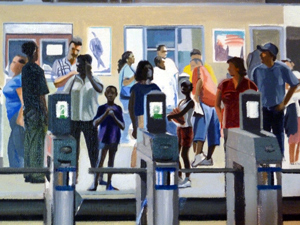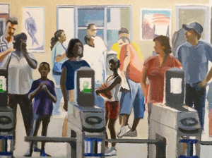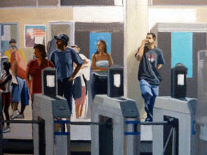 Moving ForwardFebruary 23, 2011 Sometimes it's really hard to force myself to work on a given painting. I think I should pick up on my old dissertation work and interview other artists again, this time asking them what methods they use to get started when they're not so much in the mood to work on a piece, but it has to be done. Anyway, today I got back to A Long Way To Go, after avoiding it for most of the day. I darkened the outfits on several of the people on the forefront of the crowd, and worked on the turnstiles. Also darkened the red and orange flowers in Country Bouquet, and painted the highlights on most of the pods that are hit directly by the sun. I like the way the pods look. If I stick to my present schedule and don't have too many interruptions, I could finish 7 pieces by the end of March. |