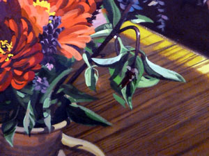 ShadowsMarch 31, 2011 Still wrestling with CSS technology, and with the detail work on Country Bouquet. Looks finished, doesn't it? But up close, there are some sloppy looking lines and inconsistencies. I'm also trying to get the shadow line on the right side of the table to have a softer edge... The architectural element that's throwing the shadow on the table is some distance away; therefore, the shadow should have a soft edge. The jug, on the other hand, casts a sharp shadow because of its proximity to the table surface. Painting the soft shadow requires a mix of five different colors, and a lot of blending. After this,there's some work to do on the leaves, the delphinium centers, some of the wood grain, and the green/white pods. But it might be done in a month. |