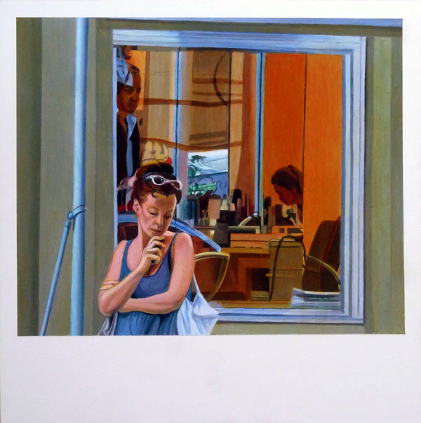 If you look closely, you can see a cell phone in the woman's hand. A rain shower had just passed as she left the beauty salon seen through the window behind her, and as she stood under an awning, she carried on a conversation over the phone. Once it ended, I was struck by her introspection, and wondered what had transpired to make her look so absorbed in thought. |